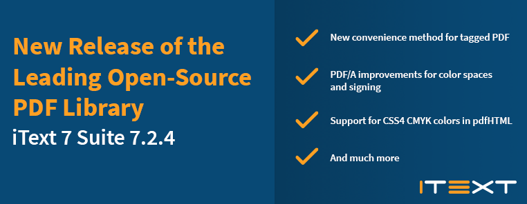 As the last quarter of 2022 rolls around, it’s time for our final release of the year for the iText 7 Suite PDF SDK. While there’s nothing quite as big to announce as the Android reference implementation from last time, we do have a few cool new things in iText 7 Suite 7.2.4 to tell you about. For the iText 7 Core PDF library there’s a nice convenience method improvement for creating tagged PDFs. We’ve also made a couple of changes relating to default color spaces for PDF/A documents and for PDF/A detection in the sign module.