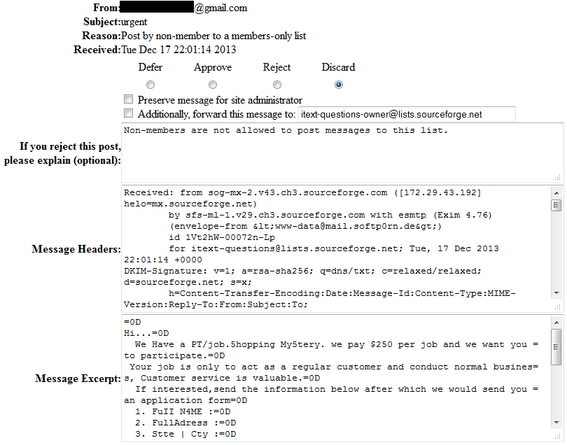 In previous blogs (Why your mail doesn't show up on the mailing list) and YouTube videos (The internal kitchen at iText: how we fight SPAM), we already explained the mechanics behind systems such as the iText mailing-list. The following screen shot is yet another example of the administrative interface that is used to keep subscribers of the mailing list from receiving SPAM:
