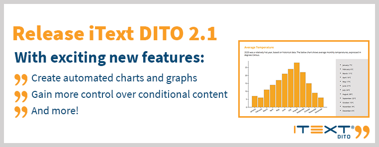 Since the release of iText DITO 2.0 at the end of March this year we’ve continued to build upon the changes it introduced, such as the further integration of the new iText DITO Manager component with the Editor. For this release we’ve also implemented a number of new features, including one we’ve been working on for quite some time. We now support the automated creation of charts in templates, which has been a much-requested feature.