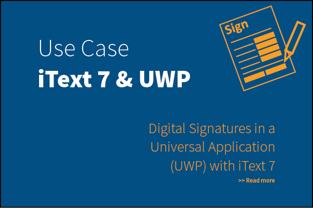 Recently we found Paul Madary's blog post about digital signatures in files in a UWP app with iText, and we wanted to share it. Paul gracefully agreed to let us do that, and as a bonus we upgraded the code to be usable out-of-the-box with iText 7.1.3. The only change needed is to the SignDocumentSignature method.
