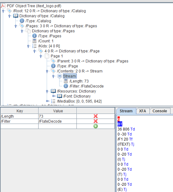 When we examine the file using iText RUPS, we see that the content stream of the page contains the text ITEXT: