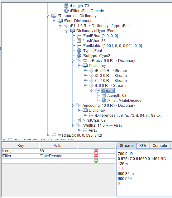 In the screen shot, we see the glyph description for the I character. The advance in x-direction is 700, whereas the advance in y-direction is zero as defined in the PDF specs. We define a color with the RG, a line width with the w operator and the line cap with the J operator. The we construct a path with the m (moveTo) and l (lineTo) operator and we stroke the path with the S operator.