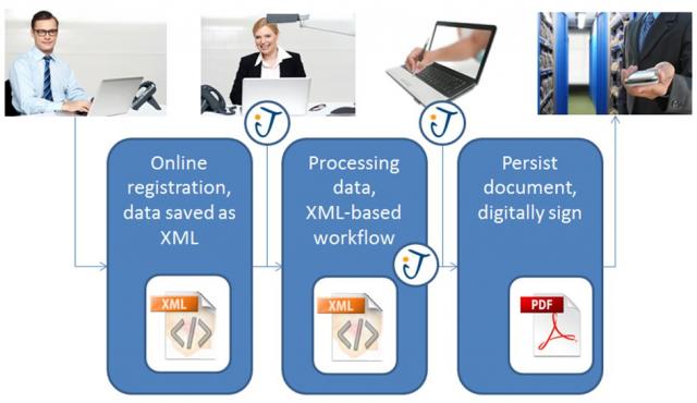The above figure shows an example how iText can automate such processes, combining machine-readable XML with human-readable PDF documents: