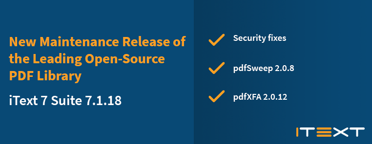 So, in that same spirit we’re now releasing a new maintenance version of iText 7 Core, plus compatible versions of the pdfSweep and pdfXFA add-ons for our iText 7.1.x users. This release includes some recent CVE mitigations and backports from 7.2.x releases.