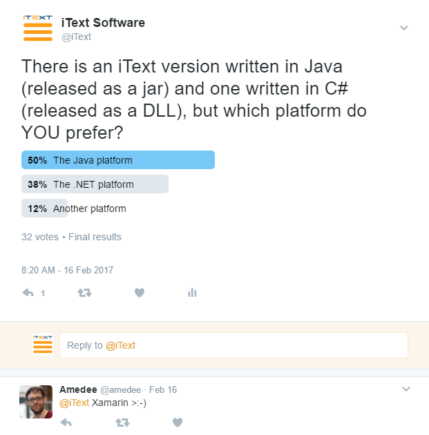 It seems that the Java platform is the most popular among developers who follow us on Twitter: half of them prefer the Java platform. Looking at the questions posted on StackOverflow, I would have guessed that the numbers would be more in balance, because it feels as if there are about as many questions about iText for Java as there are as about iText for C#. Maybe we just need some more C# developers to follow us on Twitter.