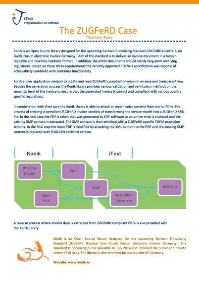 "Konik is an Open Source library designed for the upcoming German E-Invoicing Standard ZUGFeRD (Central User Guide Forum electronic Invoice Germany). Aim of the standard is to deliver an invoice document in a human readable and machine-readable format. In addition, the entire documents should satisfy long-term archiving regulations."